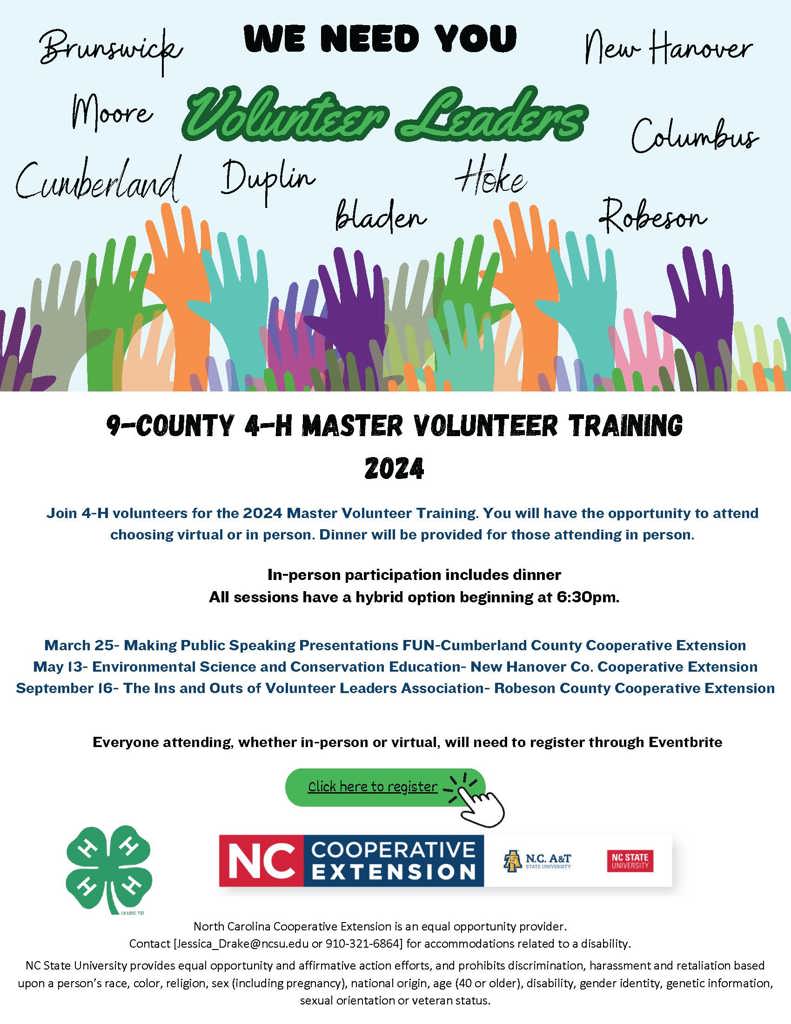 Please join us on April 24 for a special 4-H Volunteer Appreciation Luncheon. The week of April 22 is National Volunteer Week and we think this is the perfect time to recognize you for all that you do for 4-H, the community, and for just being you! We will start our Garden Party program promptly at 12:15 and make sure to finish in a timely manner for those of you needing to get back to work. During this event we will recognize you, our 4-H Volunteer of the Year, and have lots of surprises blooming for you. Please register by clicking this link: https://www.eventbrite.com/e/4-h-volunteer-appreciation-luncheon-tickets-857103548787 Deadline to register will be April 17. Please see the flyer below with more information or go to our blog at: https://robeson4-h.blogspot.com/2024/03/4-h-volunteer-appreciation-lunch.html If you have any questions about any of these programs please contact Shea Ann DeJarnette at Shea_Ann_DeJarnette@ncsu.edu or Jade McNeill at Jade_McNeill@ncsu.edu.